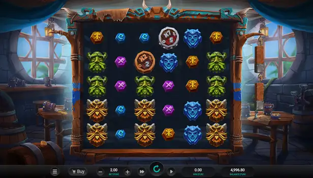 Ett träbräde med en genomskinlig bakgrund är där saker och ting utspelar sig i Volatile Vikings 2 och spelramen är dekorerad med tidstypisk vikingdesign. Bakom den kan man se vad som mest liknar en taverna med barstolar, mjödbägare, guld och tunnor. Det finns också ett par bord med prydnadssaker och utspillda drycker, allt som är typ perfekt för temat.